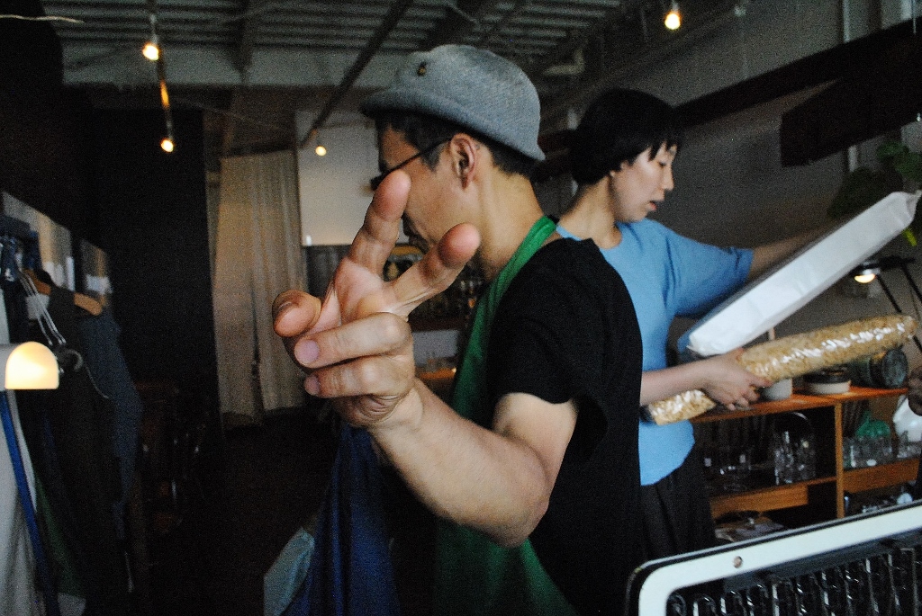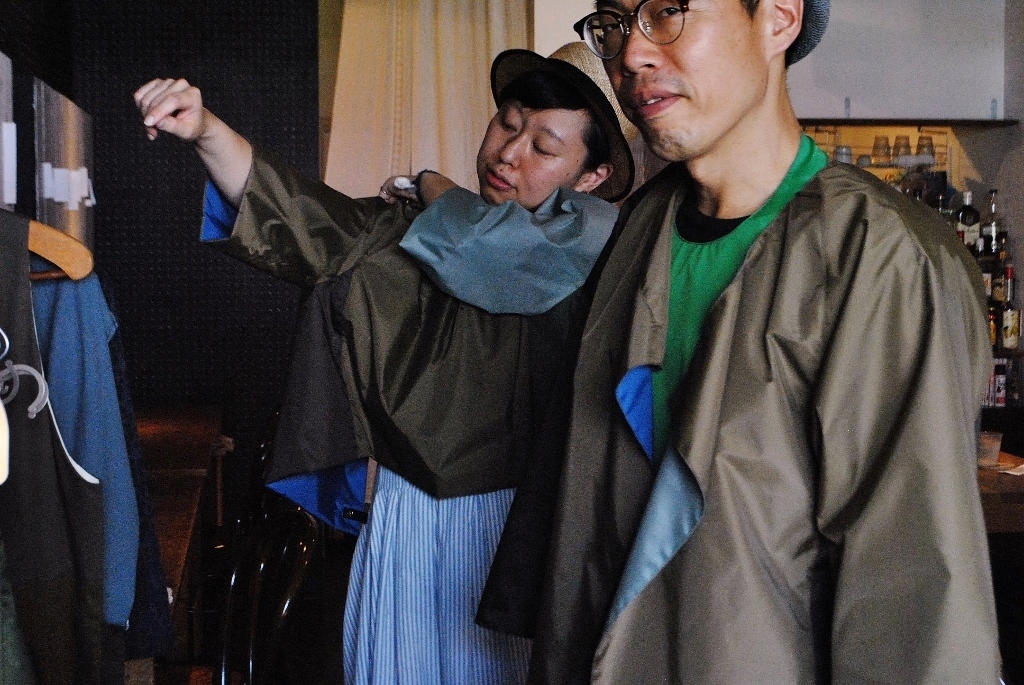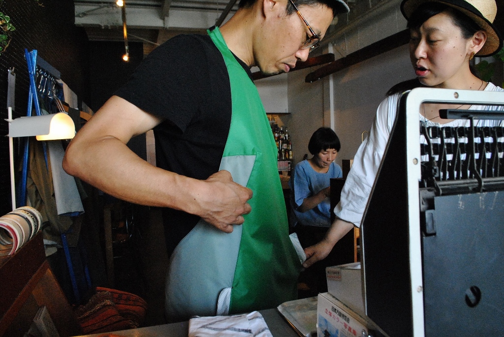 居合わせたお客様に撥水エプロンのモデルをと。四人中二人しか着てくれませんでした。皆さん表現屋で 8/27.28は洞爺湖が舞台だそう。見に行きたい。一緒にいきませんか。