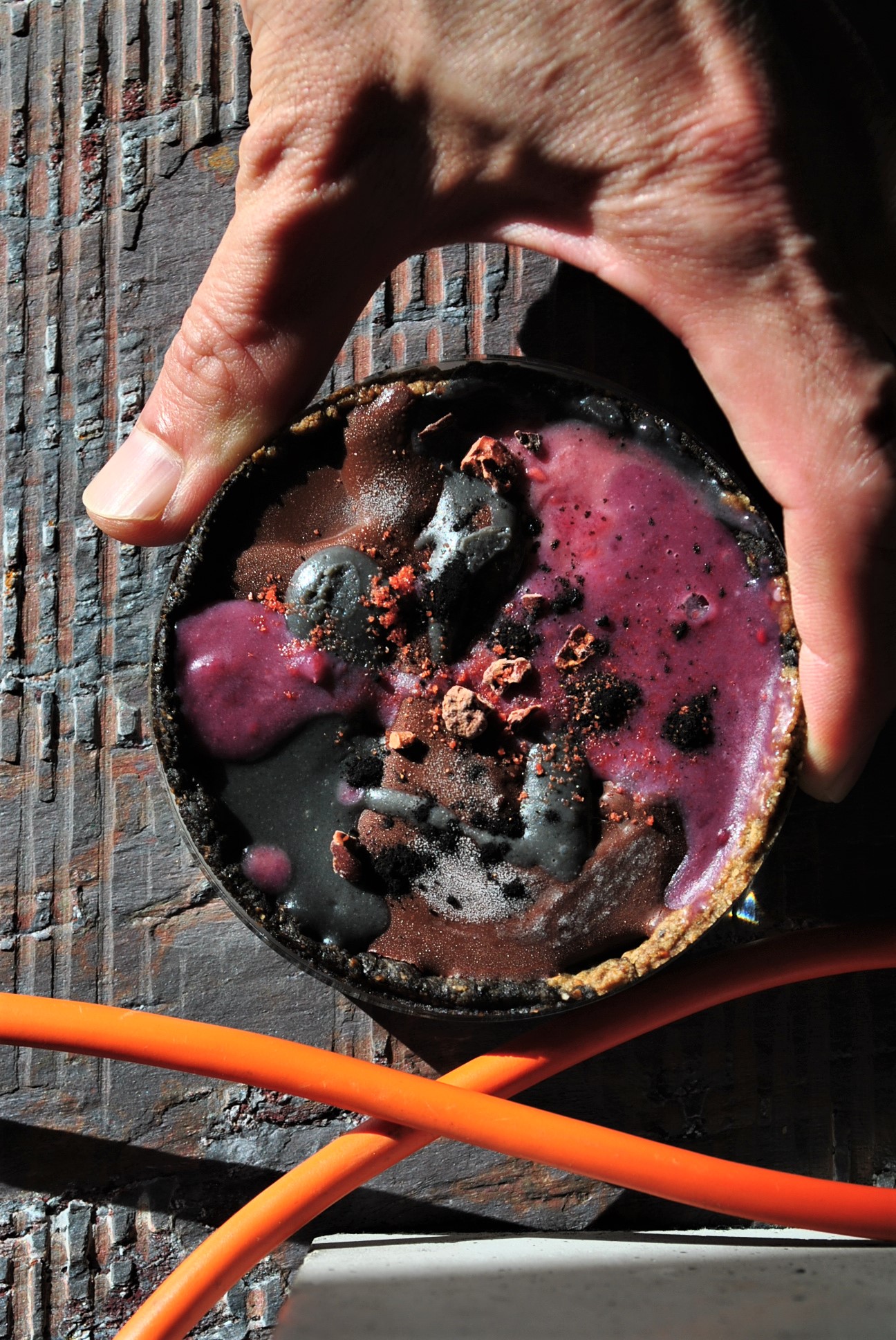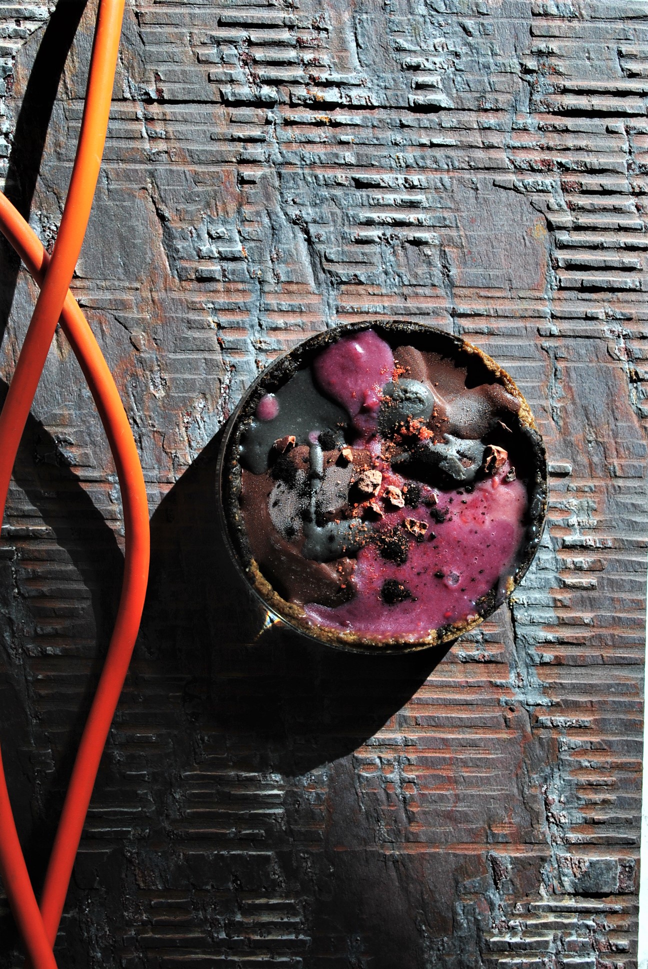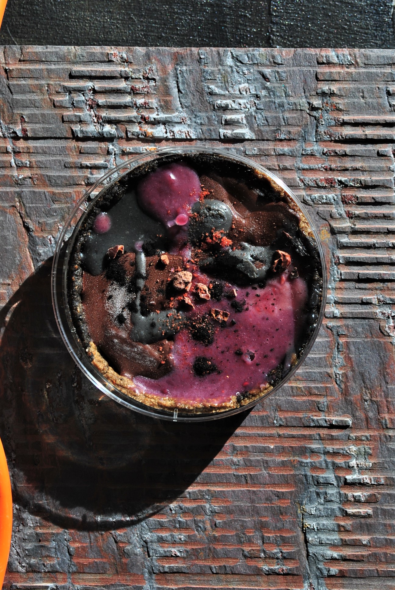 ココアとピタヤと黒ゴマで焼き上げたマーブルクッキーの器に、
