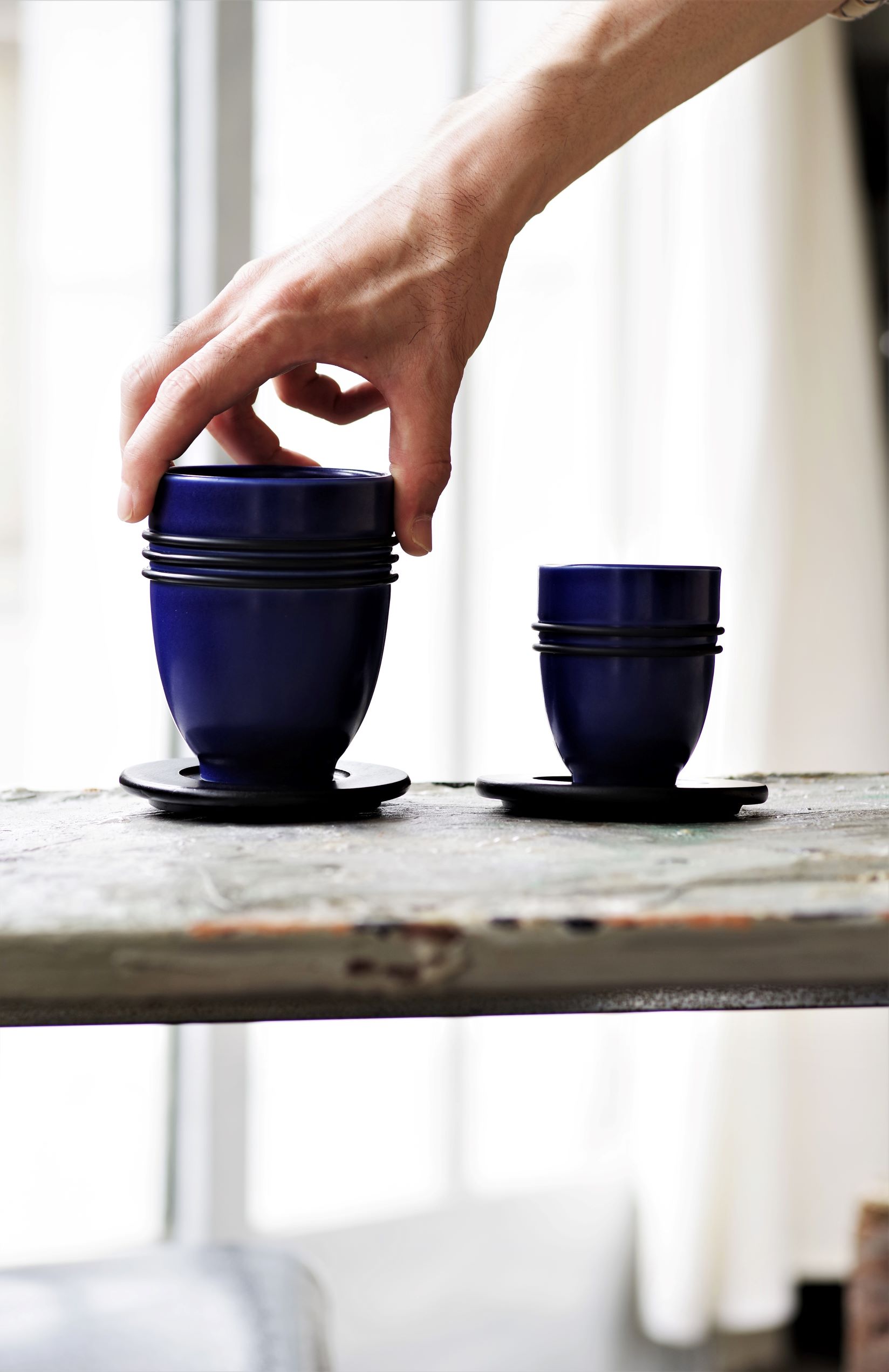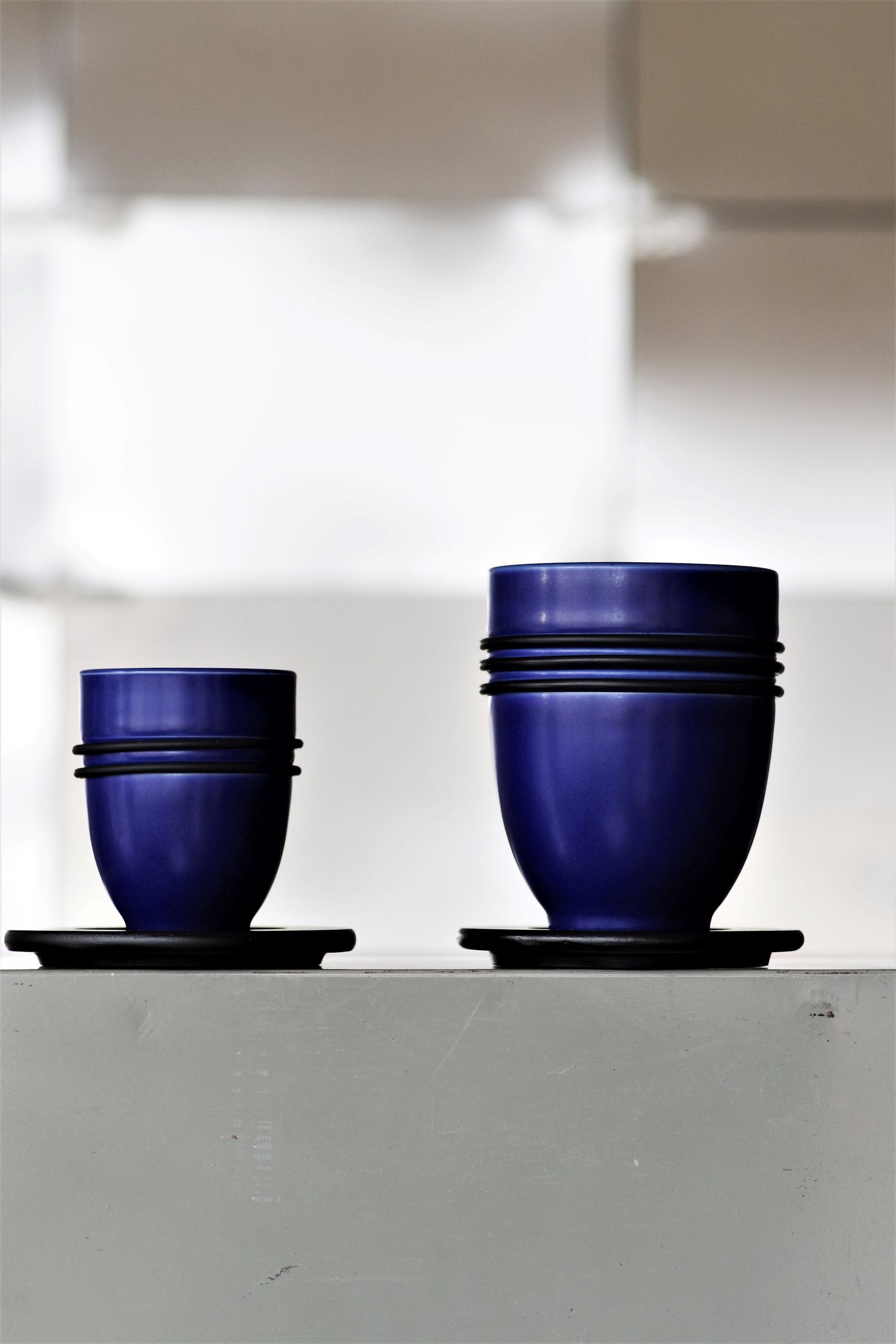 陶器のカップに滑り止めゴムリング2本デザイン。