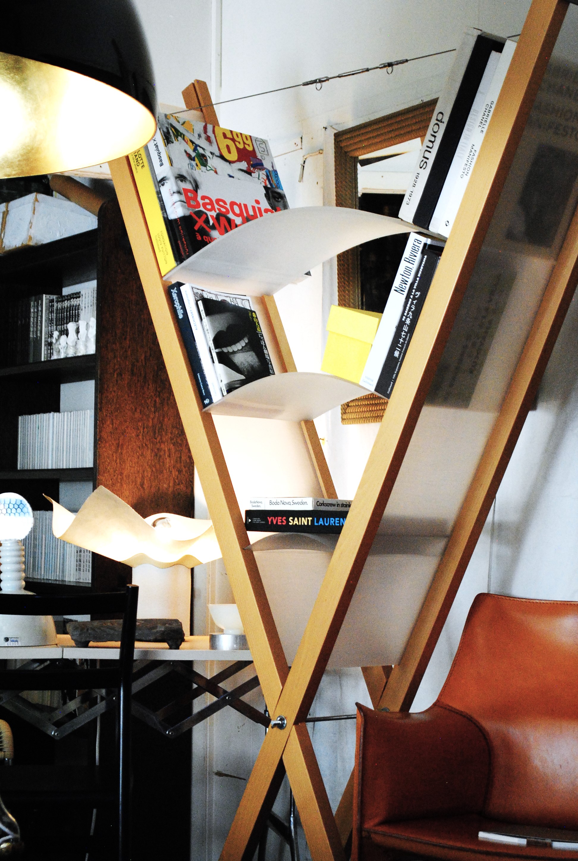ブナ材の小さな本棚。 3 つのプレキシガラスの棚は湾曲しており、スチール製のタイ ロッドのおかげで木製の構造内に張力がかかっています。